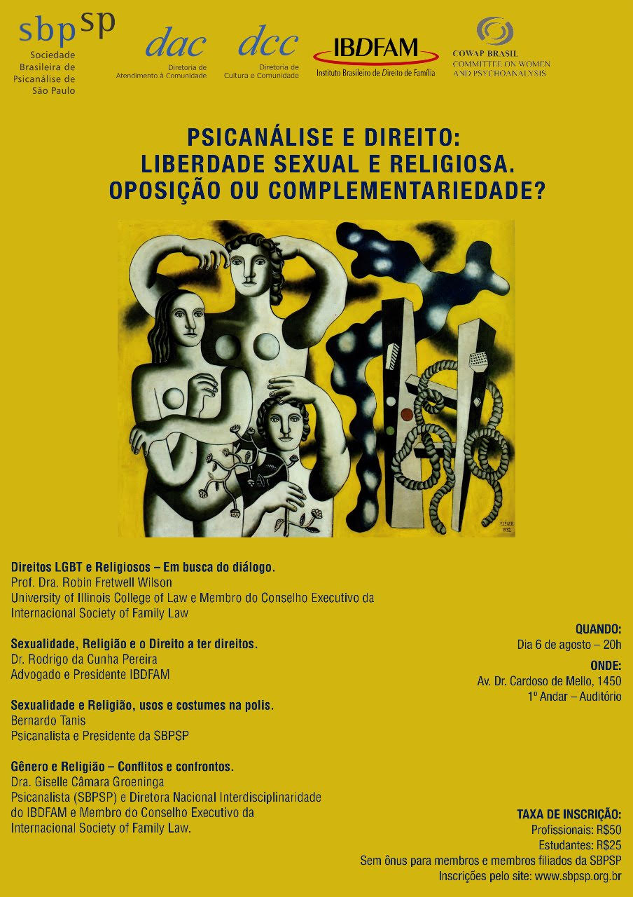 Promovido pela Sociedade Brasileira de Psicanálise de São Paulo com apoio do Instituto Brasileiro de Direito de Família (IBDFAM) o evento terá como tema “Psicanálise e Direito: Liberdade sexual e religiosa. Oposição ou complementaridade?”. Com exposições do advogado Rodrigo da Cunha Pereira, da professora Robin Frtwell Wilson, Dr. Bernardo Tanis e Dra. Giselle Groeninga. Sobre a ...